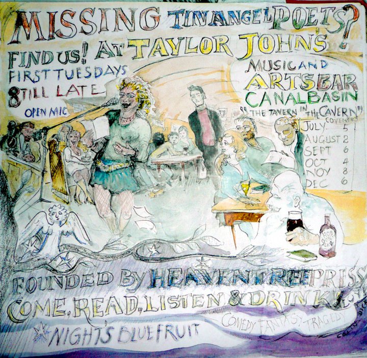 Martin Green’s vignette about poems written on the inside of a cigarette packet was good, “Citizen” Andy Biddulph was on top form with his political polemics, Josie conjured up a memorable erotic image of a walnut smooth chest and Colin Dick, poet and painter was as inspirational as ever.