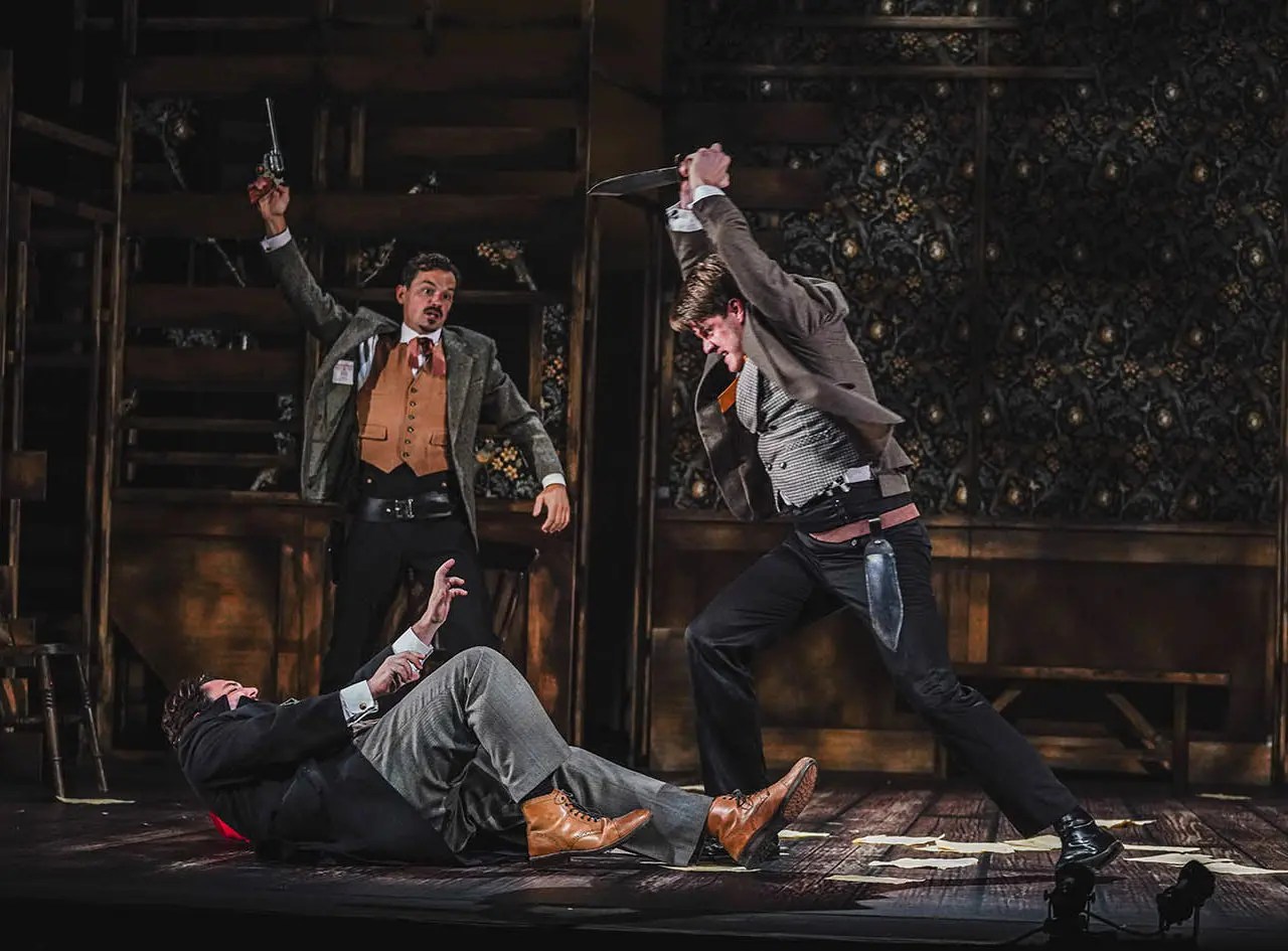 The original novel is split into two distinct parts, the first comprises the conventional whodunnit. The second part, which is lengthier than the first, is the backstory of the characters who find themselves the subject of Holmes’ enquiries. Lane takes the two very distinct stories and interweaves them, using a cast of five role-switching actors performed on a single set lavishly designed by Victoria Spearing which joins the two worlds. The costume design by Naomi Gibbs is sumptuous. This storytelling in parallel does require close concentration as we try to work out how the London and Pennsylvania locations, and their events, conjoin. The role swapping /sharing demands of the production are hugely demanding on the cast with Alice Osmanski playing three parts, and Blake Kubena working similarly hard, but offering a consequent essential energy which is vital to the production.