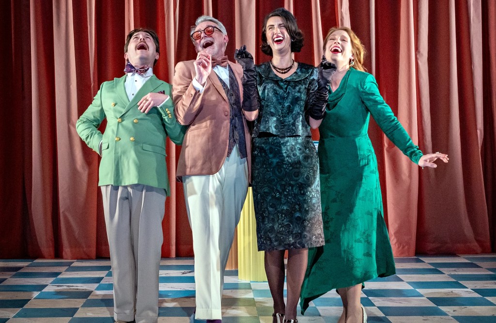The School for Scandal was written almost 250 years ago . Director Seán Aydon updates the play by changing the setting, complete with period telephones, and stylish costumes , from 1777 to the 1950s. Sarah Beaton’s 1950s set and costume design is lush and lavish , bathed in pinks, greens, oranges and aquamarine blue, oozing period glamour. I am a confirmed Sheridan fan ,that enthusiasm emanating from a production I saw of “The Rivals” fifty years ago , so I keenly awaited this production.Aydon frequently asks his cast to “strike a pose”, vogue like, for emphasis, skilfully delivered by Stephen Moynihan, the movement director, whose further role as intimacy director is unnecessary for Sir Peter and Lady Teazle. The title of the play could easily be borrowed for a comedy about Conservative Central office, Lydea Perkins bearing an uncanny resemblance to Carrie Johnson