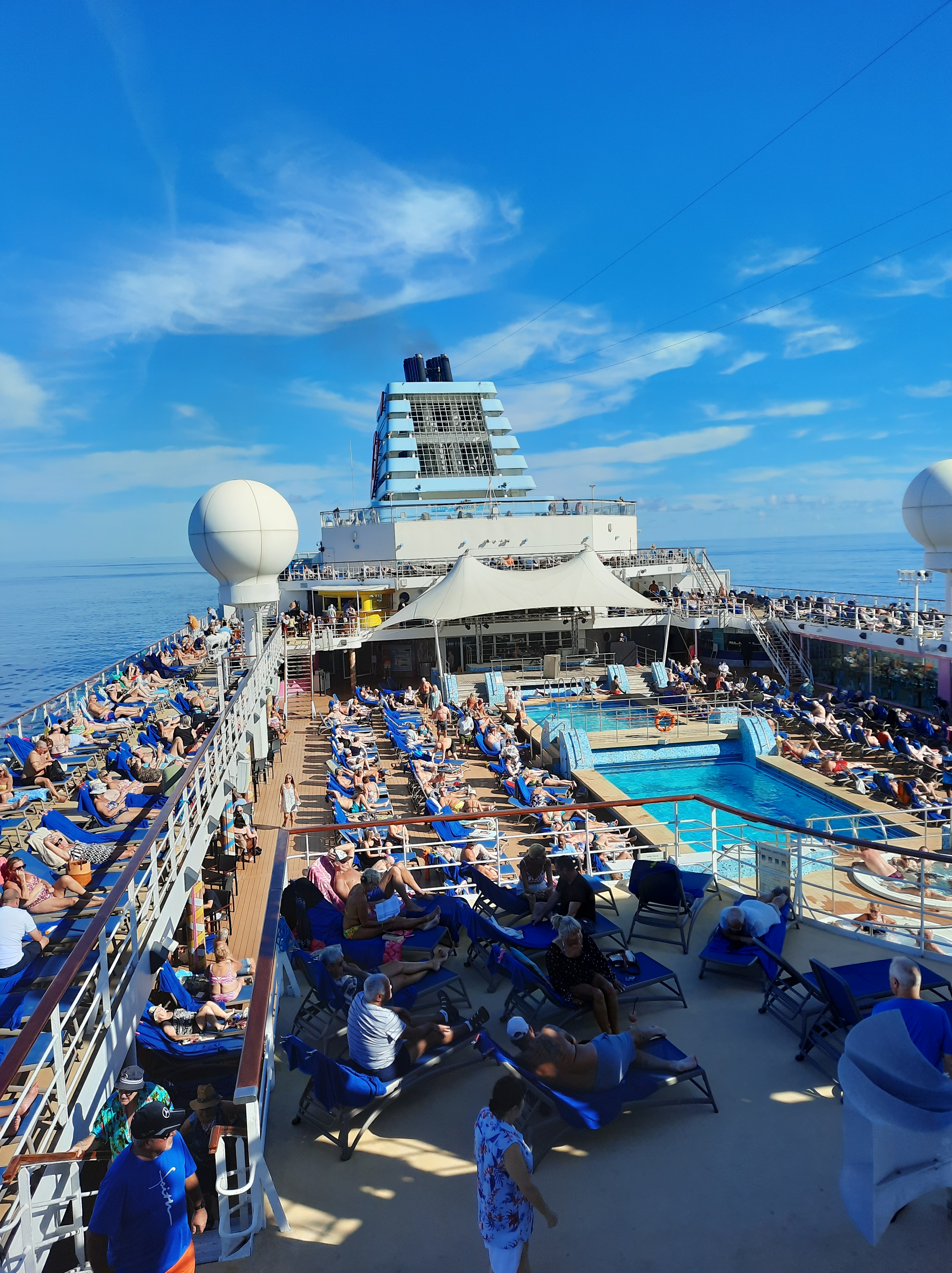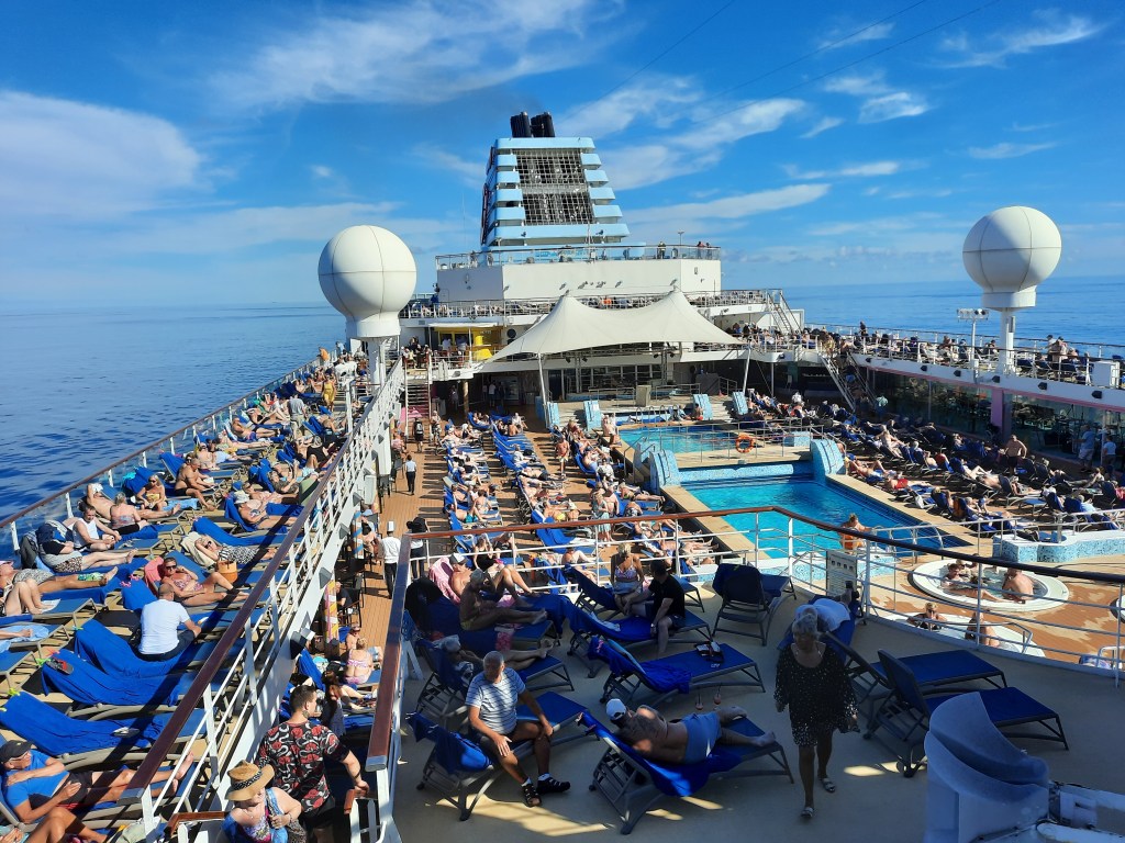 Our first voyage on Explorer 2. The weather was fine and pleasant enough to sunbathe on the pool deck.