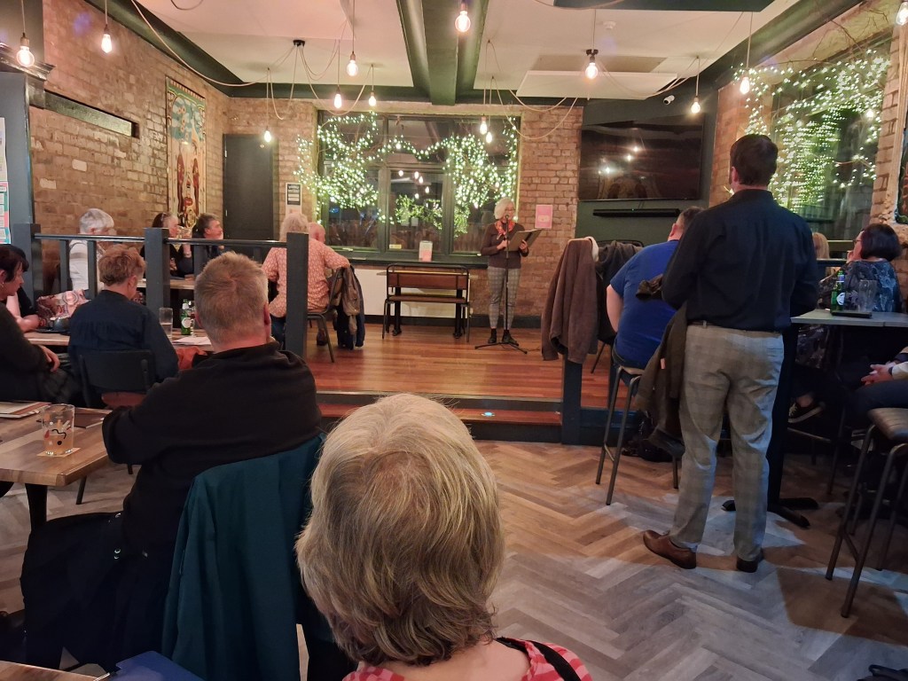 Thursday night was an informal welcome night in the Bath pub. It was a large boozer with a small stage in the corner. I wondered how the locals would react to their boozer being occupied by poets. The pub slowly filled, and filled, any locals engulfed ,till around 250 people squeezed in. “Perhaps we should have poetry nights every night! quipped the landlord.