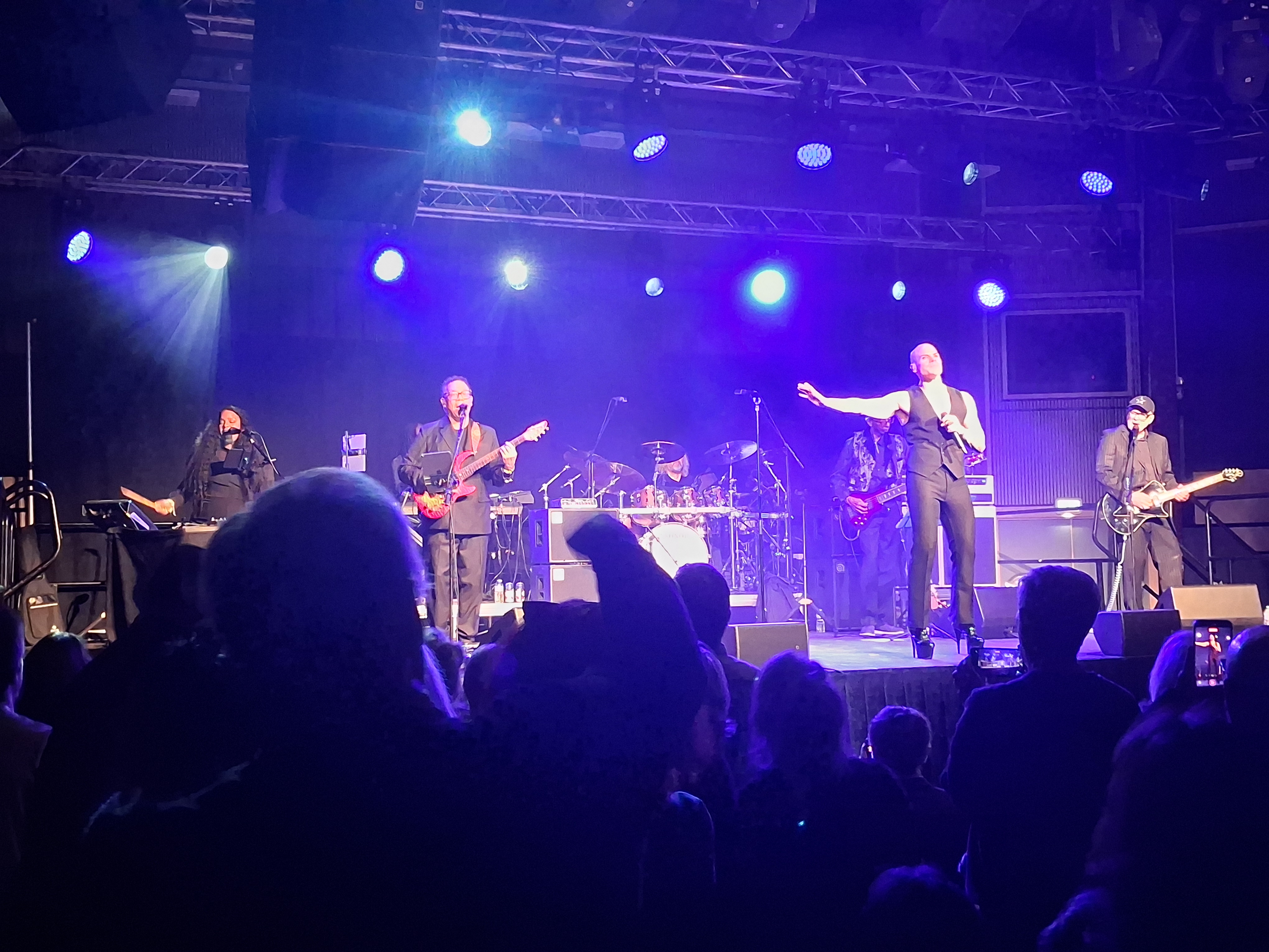 Cunio in the lead singer role did not work for me. He sang in a register consistently higher than David with an alarming tendency to screech- David moved with “animal grace” . Cunio’s movement and persona were seemingly modelled on Tina Turner. Unlike David, he was unable to be a storyteller with the songs, apparent immediately with the opening “Joe the Lion” and then with an excruciating misread of “DJ”. I am not sure that he understood some of the songs he was singing.