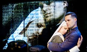 The opening is attention grabbing and compelling as a group of readers break into the set and convert into the players. A cast of six are kept busy. Laura Atherton (Catherine) and Jude Monk McGowan (Frederic) as principles remain in character, but the supporting cast of Joshua Johnson, Morven Macbeth, Matt Prendergas and Marco Rossi play multiple roles including narration. Andrew Quick and Peter Brooks have adapted and direct proceedings which are multi-dimensional, and at times technologically frenetic. The set, designed by Laura Hopkins, is sparse , invoking the sense of both a television studio and hospital ward . Simon Wainwright dominates proceedings with his video work. Steven Jackson’s impressive background music is augmented by original contributions from Jeremy Peyton-Jones with occasional piano contributions, the latter of which I found somewhat intrusive. Andrew Crofts as lighting designer will have had a few afternoons off, choosing a simple white light set from two stage side gantries.
